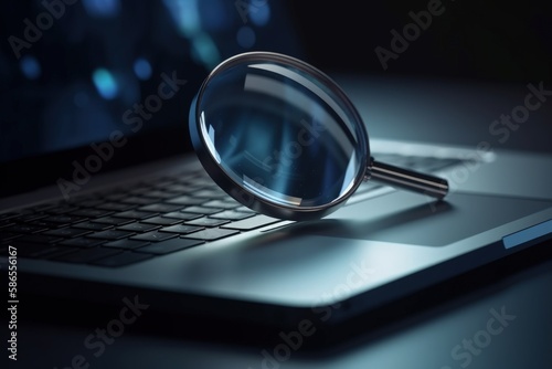 Magnifying glass and laptop illustration, analytics and research concept. Generative AI