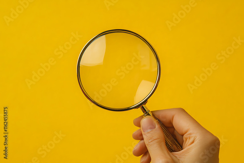 magnifying, glasses, hand-held, lens, closeup, yellow, background, gold, vintage, research, investigation, detail, explore, observe, discover, cognition, information, analysis, equipment, tool