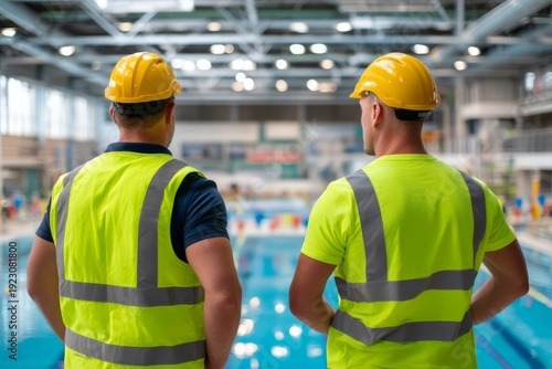 maintenance, men at work, inspecting, public, swimming, pool, safety, gear, construction, facility, environment, sport, teamwork, professional, industry, oversight, observation, infrastructure, service, indoor, leisure, recreation, management, vest, inspection, standard, health, hygiene, cleanliness, equipment, operation, training, supervision