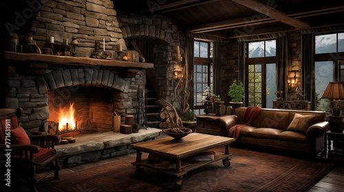 Maison rustique avec un large parquet en bois sombre et une cheminée en pierre de style rustique.