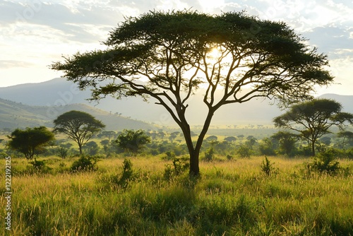 acacia, sunrise, landscape, nature, tree, serenity, africa, wilderness, sunlight, silhouette, grass, hill, calmness, scenery, beauty, outdoors, flora, environment, travel, adventure, wildlife, sky, morning, peaceful, exploration, photo, vibrant, natural, horizon, calm, scenic, lush, expansive, bright, gold, atmosphere, meadow, foliage, remote, iconic, ecological, panoramic, vista, open, wild, ecosystem, breathtaking