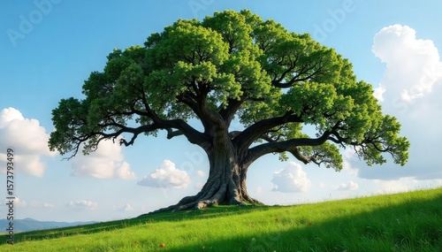 Majestic Ancient Oak Tree Reaching Towards the Sky A Timeless Symbol of Natures Enduring Power and Wisdom, Standing Tall in a Forest Setting