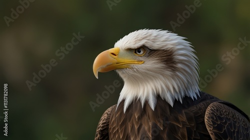 Majestic bald eagle portrait, sharp focus on head and feathers against blurred green background.