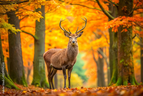 majestic brown deer stands gracefully in vibrant autumn forest, surrounded by colorful foliage. warm hues of orange and yellow create serene atmosphere, highlighting beauty of nature