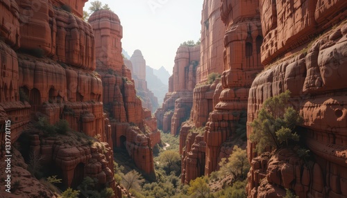 Majestic Canyon with Red Rock Formations and Lush Greenery