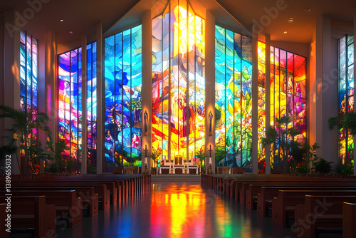 church, architecture, church steeple, stained-glass, window, biblical, sunlight, kaleidoscope, altar, sacred, prayer, greenery, serene, grandiose, faith, reverence, spirituality, interior, exterior, lush, setting, solemn, atmosphere, majestic, vibrant, towering, high-coloured, decor, row, captivating, to illuminate, enhanced, landscape, intricate, timeless, tranquil, worship, historical, spiritual, emblematic, tradition, community