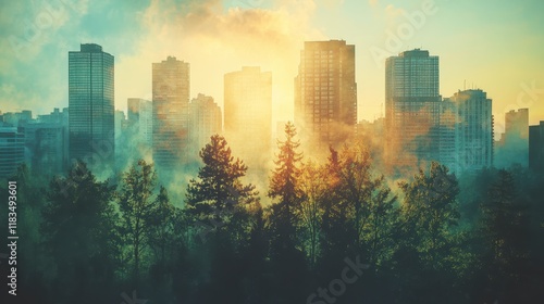 Majestic Cityscape Sunrise Foggy Urban Skyline with Trees