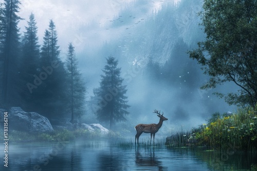 Majestic deer in misty forest lake nature scene tranquil environment a serene wildlife viewpoint