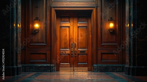 Majestic double wooden doors with glowing sconces, set within a rich wood and marble entryway.