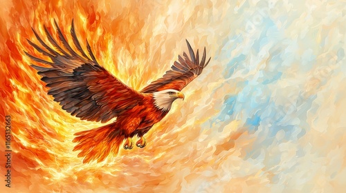 Majestic Eagle Soaring Through Fiery Sky with Graceful Wings and Vibrant Colors