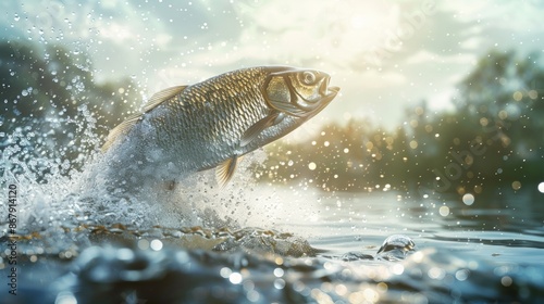 Majestic Fish Leaping Out of Sparkling River at Sunrise