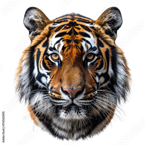 tiger, head, orange, black, white, stripes, fur, eye, ear, whisker, nose, face, animal, mammal, wild, cat, predator, felino, wildlife, big, nature, closeup, detail, portrait, skin, majestic, fierce, strong, dominant, bengal, beautiful, striking, powerful, alert, focused, stare, gaze, calm, serious, healthy, clean, clear, vibrant, isolated, bold, unique, front, looking
