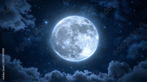 Majestic full moon with detailed surface features surrounded by luminous halo, dramatic cloud silhouettes, twinkling stars of varying magnitudes, cosmic depth