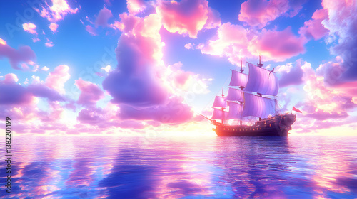 ship, ocean, sea, sunset, sunrise, sky, cloud, pink, purple, blue, calm, peaceful, tranquil, serene, majestic, galleon, sailboat, sailing, voyage, adventure, journey, travel, exploration, fantasy, dreamlike, magical, romantic, beautiful, picturesque, idylli, vibrant, colours, light, water, horizon, huge, open, freedom, solitude, hope, peace, serenity, stillness, dreamy, aethereal, fairy tale, artwork
