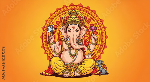 ganesh, hinduism, india, religion, spirituality, deity, wisdom, prosperity, illustration, art, drawing, graphic, vector, orange background, gold, yellow, red, lotus flower, axe, rat, mouse, mandala, ornate, decorative, traditional, cultural, festival, celebration, vibrant, colourful, divine, holy, sacred, spiritual, icon, symbolism, mythology, meditation, prayer, devotion, indian culture