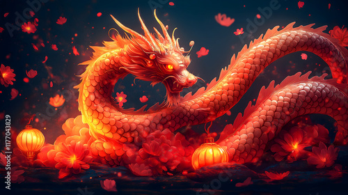 dragon, red, glowing, lantern, fire, mythical, flower petals, traditional, chinese, asian, culture, celebration, heritage, oriental, majestic, mystical, snake, powerful, symbolic, legendary, artistic, decorative, harmony, fantasy, vibrant, illuminated, fierce, folklore, mythology, beauty, elegant, cultural, exotic, prosperity, scenic, dramatic, atmospheric, creature, classic, fantasy art, mysterious, surreal, aesthetic, magical, tradition, luxury