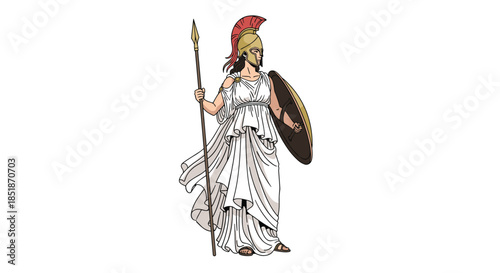 athena, mythology, ancient greece, warrior, armoring, spear, shield, wisdom, strategy, justice, art, culture, history, isolated, white background, graphic, illustration, vector, deity, olympus, powerful, strong, goddess, guardian, courage, strength, legend, epic, historical, classical, old, vintage, hero, mythical, fantasy, character, battle, warfare, roman