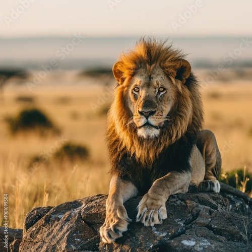 Majestic lion resting on a rock in the savanna during golden hour at sunrise