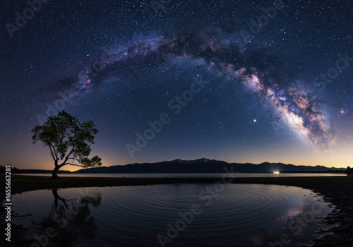 Majestic milky way arching over a serene lake with a lone tree reflection