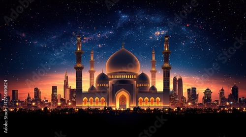 Majestic mosque at night, city skyline, starlit sky, Ramadan greeting card