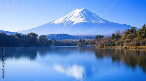 Majestic Mount Fuji Reflecting in Tranquil Lake Waters under Azure Sky