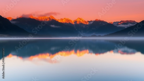 mountain, lake, sunrise, landscape, water, nature, scenic, sky, dawn, dusk, twilight, serene, tranquil, peaceful, calm, morning, cloud, horizon, silhouette, golden hour, light, fog, misty, atmospheric, idylli, majestic, alpine, peak, summit, ridge, range, environment, background, vista, panorama, scenery, travel, tour tourism, outdoors, beautiful, stillness, quiet, dreamy, aethereal, beauty, natural, purity, immensity