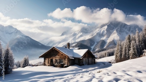 Majestic mountain range, covered with a layer of snow, beautiful and lonely cottage located in the valley