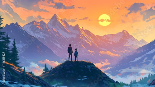 Majestic Mountain Sunset Two Figures Gaze At View