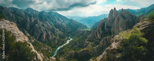 Majestic mountain valley with dramatic cliffs and serene river under cloudy sky
