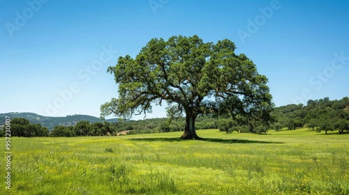 Majestic oak tree in a lush green field under a clear blue sky