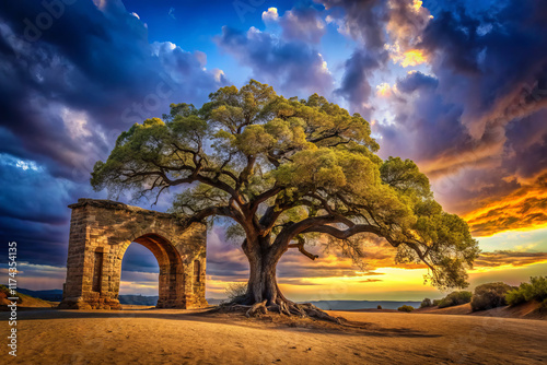 oak tree, sunset, dramatic sky, landscape, nature, cloud, silhouette, ancient, scenic, calmness, golden hour, root, horizon, beautiful, park, greenery, sunlight, evening, serene, majestic, historical, environment, sky, foliage, warm colors, artistic, natural beauty, peaceful