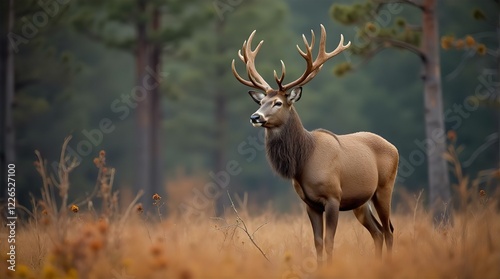 cervid, elk, stag, antler, forest, wood, autumn, fall, brown, gold, tan, orange, nature, wildlife, animal, majestic, regal, powerful, serene, calm, peaceful, wild, free, noble, proud, strong, photogenic, beautiful, elegant, graceful, vibrant, rich, earthy, muted, soft, light, shadow, depth, field, background, tree, grass, landscape, photo, image, picture, wilderness