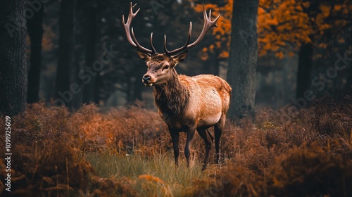 Majestic red deer stag standing in autumn forest