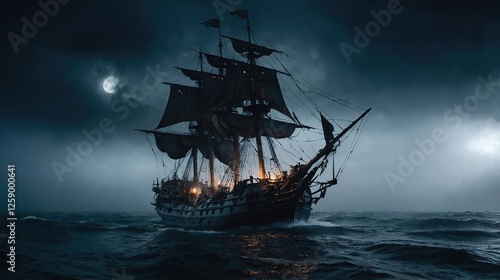 ship, sailing, ocean, storm, dark, night, sky, bat, wave, light, vessel, nautical, adventure, seafaring, navigation, maritime, weather, stormy, eerie, atmosphere, travel, moonlight, coastline, exploration, journey, historic, fantasy, pirate, danger, mystery, shadow, haunting, gloom, wildlife, story