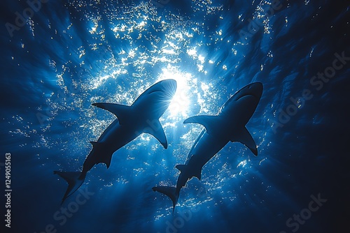 Majestic Sharks Silhouetted Against Sunlight Underwater