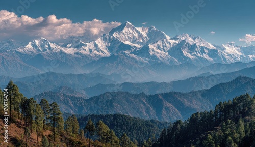 mountain, peak, snow, range, landscape, nature, scenic, view, vista, summit, high, altitude, majestic, grand, epic, serene, tranquil, peaceful, sky, blue, cloud, atmosphere, geology, terrain, wilderness, remote, travel, adventure, exploration, trekking, hiking, climbing, alpine, environment, natural, beauty, panorama, horizon, distance, layer, hill, forest, pine, tree, green, evergreen, sunlight, daylight