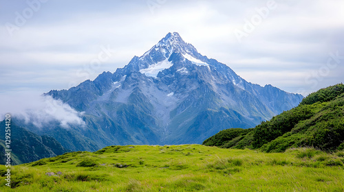Majestic snow-capped mountain peak, scenic valley, clouds, green pasture. Ideal for travel brochures