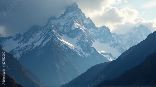 Majestic Snow-capped Mountains and Valley Landscape Under Cloudy Sky
