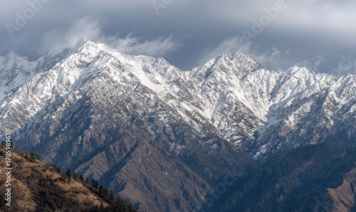 Majestic snow-capped mountains pierce the cloudy sky, contrasting with brown slopes and evergreen trees below. Serene and dramatic landscape captured