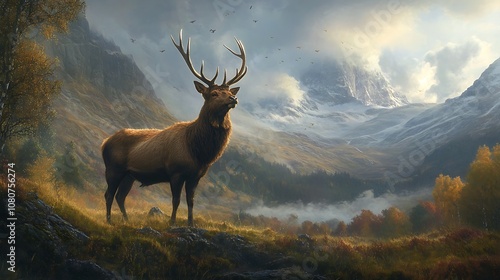 stag, cervid, mountain, vale, landscape, nature, wildlife, forest, mist, fog, snow, sky, cloud, sun, light, autumn, fall, tree, grass, rock, antler, brown, green, blue, white, grey, gold, yellow, art, painting, illustration, digital, artwork, fantasy, magical, serene, peaceful, majestic, wild