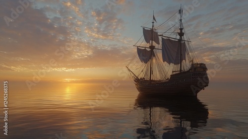 Majestic Tall Ship Sailing at Sunset Over Calm Ocean