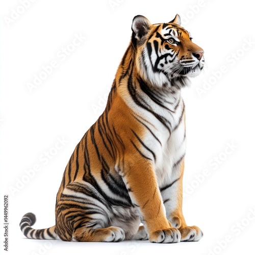 Majestic Tiger Sitting Gracefully with Striking Orange Fur and Distinctive Black Stripes Against a White Background