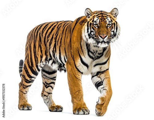 Majestic tiger strides, orange fur contrasted with dark stripes, eyes focused forward on a clean white background