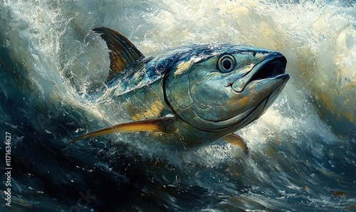 tuna, ocean, wave, water, splash, painting, art, fish, marin, wildlife, nature, aquatic, underwater, blue, gold, green, texture, vibrant, powerful, dynamic, energy, movement, speed, majestic, creature, predator, jump, leap, sea, current