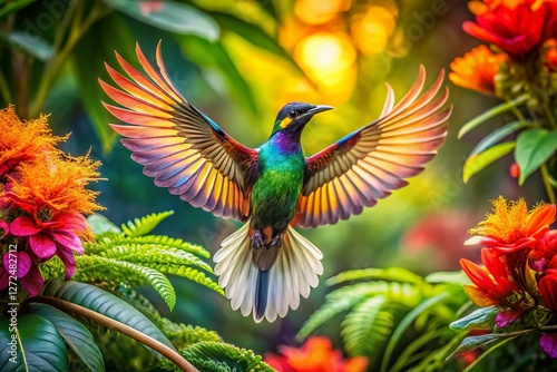 bird, double exposure, tropical, foliage, nature, wildlife, photo, animal, avian, exotic, feather, wing, jungle, rainforest, vibrant, colourful, green, blue, flower, plant, leaf, sunlight, shadow, detail, sharp, blur, texture, art, image, picture, background, wallpaper, design, illustration, graphic, visual, element, asset, resource, tropical bird