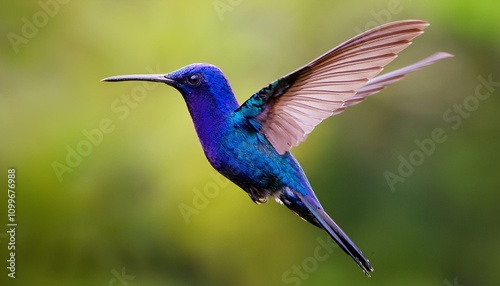 "Majestic Violet Sabrewing Hummingbird Soars Against a Blurred Green Jungle Backdrop"