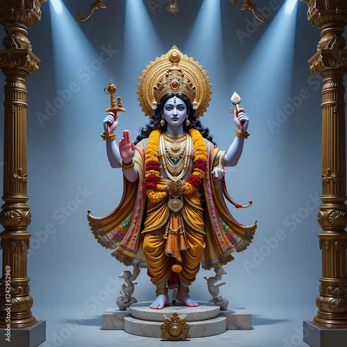 vishnu, statue, temple, spiritual, gold, yellow, blue, photo, decor, artwork, faith, culture, divine, sculpture, pose, ornate, religious, worship, idol, image, hinduism, india, religious icon, sacred, holy, traditional, belief, prayer, meditation, high-quality, print, download