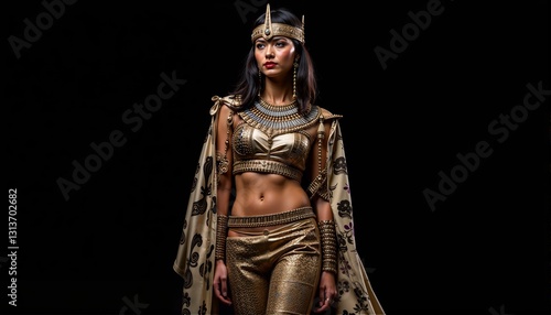 fashion, runway, model, gold, attire, elegance, confidence, beauty, clothing, show, performance, designer, expression, creativity, glamour, striking, elaborate, costume, pose, stage, audience, light, movement, showcase, cultural, art, stunning, detailed, intricate, fabric, craftsmanship, style, contemporary, tradition, fierce, regal, optical, inspiration, bold, character, dramatic, theatrical, ambience, luxury
