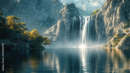 Majestic Waterfall Cascading Into Tranquil Lake Surrounded by Lush Greenery and Rugged Mountains in Serene Nature Landscape