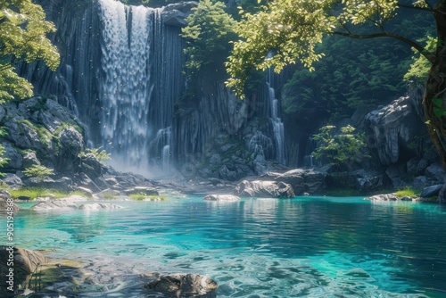 waterfall, pool, water, cascade, turquoise, blue, green, rock, cliff, forest, nature, tree, foliage, leaf, sunlight, light, shadow, mist, spray, splash, serene, peaceful, tranquil, pristine, lush, vibrant, beauty, scenic, landscape, travel, wilderness, breathtaking, wonder, magnificent, majestic